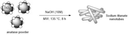 玻璃瓶在高溫下也會(huì)受到強(qiáng)堿性溶液的嚴(yán)重侵蝕。尤其是pH值為10或更高的氫氧化鈉或氫氧化鉀溶液會(huì)導(dǎo)致玻璃嚴(yán)重腐蝕,從而降低小瓶的壓力穩(wěn)定性。此反應(yīng)在碳化硅容器中可以很順利的進(jìn)行,一個(gè)典型的例子是鈦酸鹽納米管的制備(方案2)[4]。