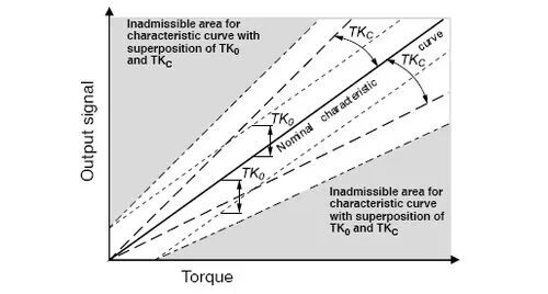 一個(gè)額定扭矩為1kN⋅m的扭矩傳感器,溫度對(duì)零點(diǎn)的影響TK0 ≤ 0.05%, 參考溫度為23°C,額定溫度范圍為+10°C至+60°C。如果傳感器在33°C(或13°C)的溫度下工作,零點(diǎn)信號(hào)偏差可能高達(dá)標(biāo)稱靈敏度的0.05%,對(duì)應(yīng)于0.5Nm的偏差。該偏差與傳感器加載的扭矩?zé)o關(guān)。在43°C(與額定溫度相差20 K)下使用相同的傳感器,在最壞的情況下,可能導(dǎo)致最大偏差高達(dá)0.1%。其不適用于在3°C下使用,因?yàn)樵摐囟炔辉跇?biāo)稱溫度范圍內(nèi)