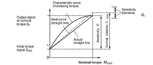 靈敏度C被表示為特性曲線的斜率。特性曲線為連接未加載的扭矩傳感器的 輸出信號(hào)SM0和額定扭矩輸出信號(hào)Sn之間的直線。簡(jiǎn)單表達(dá)式為:C = Sn − SM0