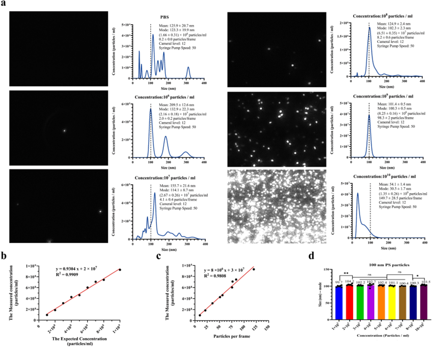 作者使用了不同大小的聚苯乙烯 (PS) 和二氧化硅 (SiO2)標(biāo)準(zhǔn)顆粒,在不同的粒子濃度下進(jìn)行了測(cè)量,并比較了不同濃度下的平均尺寸和濃度偏差。結(jié)果顯示,當(dāng)粒子濃度在108-109 particles/mL之間時(shí),測(cè)量結(jié)果最為準(zhǔn)確,線性趨勢(shì)最好。此時(shí)對(duì)應(yīng)視野內(nèi)的顆粒數(shù)為10-100和400-6500個(gè)。