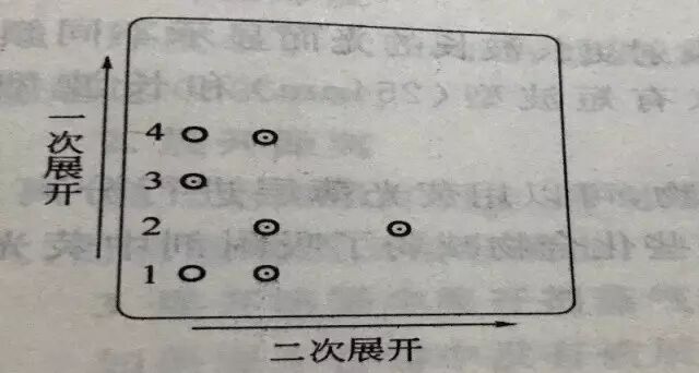對于某些復雜或難分離的成分,可采用雙向展開法或者二次展開法,雙向展開即在方形的薄層板的相鄰兩邊分別劃一條直線,相交于一點為原點,將樣品溶液點于此點上,先用一種展開劑沿著一個方向展開,吹干展開劑,調(diào)轉(zhuǎn)薄層板,再用另一種展開劑進行第二次展開,對復雜難分離的樣品有較好的分離效果,如圖。
