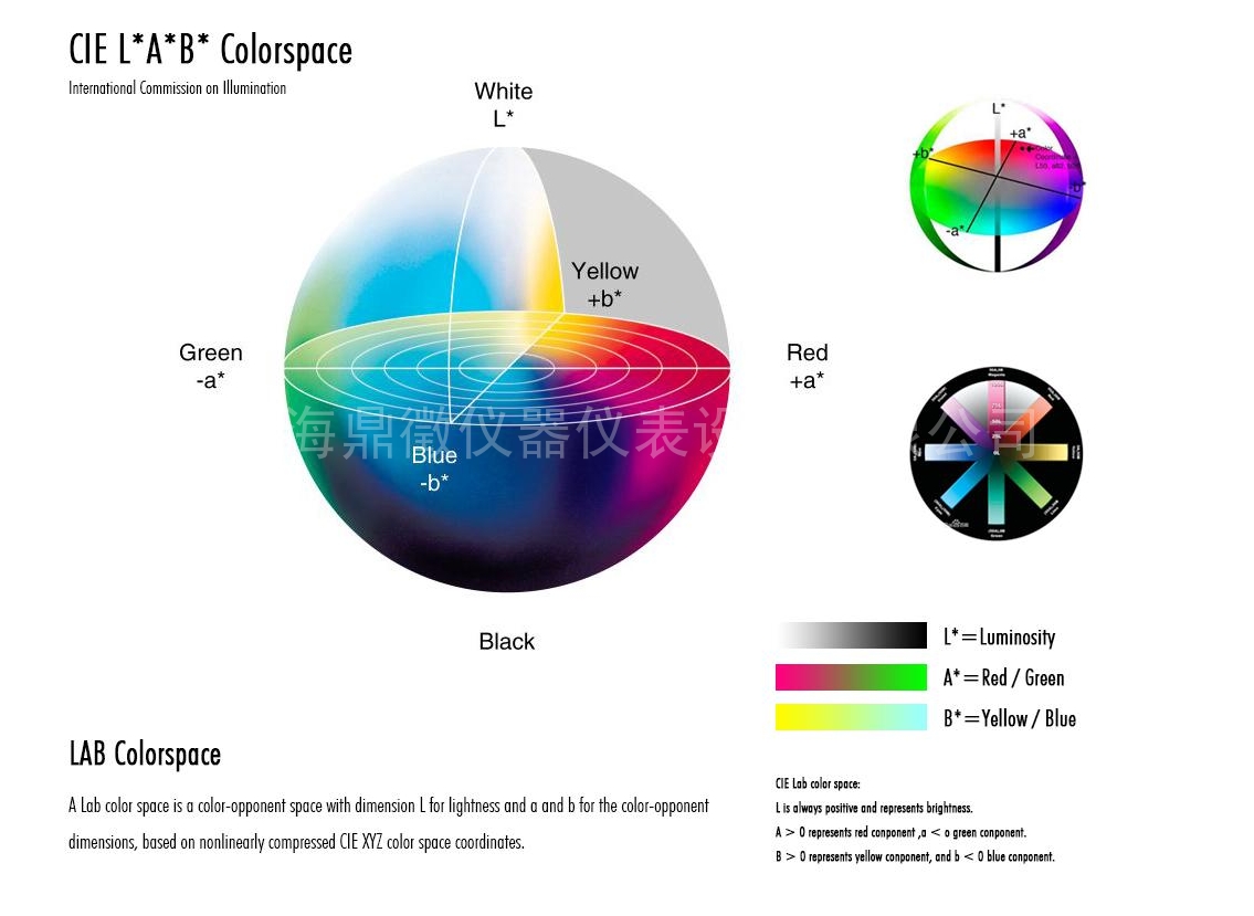 這里測(cè)量的任何一種顏色都可以通過(guò)Lab顏色表示方法感知并測(cè)量得出。其中L表示亮度,100為白;a表示紅綠,正值為紅,負(fù)值為綠,0為中性色;b表示黃藍(lán),正值為黃,負(fù)值為藍(lán),0為中性色。通過(guò)Lab可以輕松表示出試樣和標(biāo)樣的顏色差異,通常情況下會(huì)用Δa、Δb、ΔL為標(biāo)識(shí)符,ΔE被定義為樣品的總色差,但其不能表示出試樣色差的偏移方向,ΔE數(shù)值越大,說(shuō)明色差越多。色差儀可以根據(jù)CIE色度空間的Lab、Lch原理,測(cè)量顯示出試樣與標(biāo)樣的色差ΔE及Δa、Δb、ΔL值。