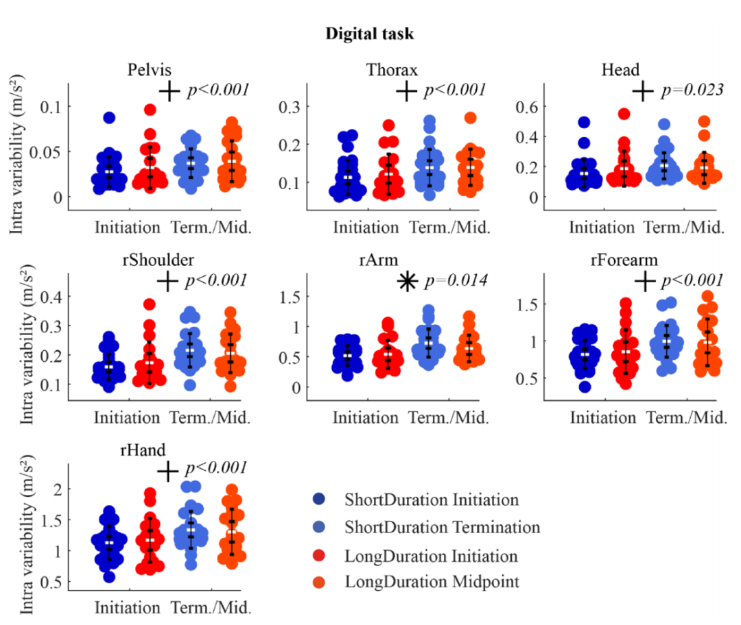 圖4 數(shù)字任務(wù)中,啟動(dòng)階段(Initiation)和任務(wù)結(jié)束/中期階段(Term./Mid.)加速度幅度的四分位數(shù)間距。