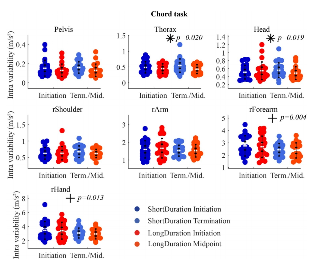 圖5 和弦任務(wù)中,啟動(dòng)階段(Initiation)和任務(wù)結(jié)束/中期階段(Term./Mid.)加速度幅度的四分位數(shù)間距。