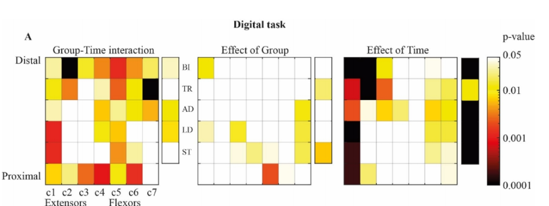 圖3 (A)數(shù)字任務(wù)中EMG變異性變化。 使用顏色映射表示ANOVA結(jié)果的p值,包括組與時(shí)間的交互作用(左側(cè))、組的主效應(yīng)(中間)和時(shí)間的主效應(yīng)(右側(cè))。BI為肱二頭肌;TR為肱三頭??;AD為前三角??;LD為外側(cè)三角?。籗T為上斜方肌。