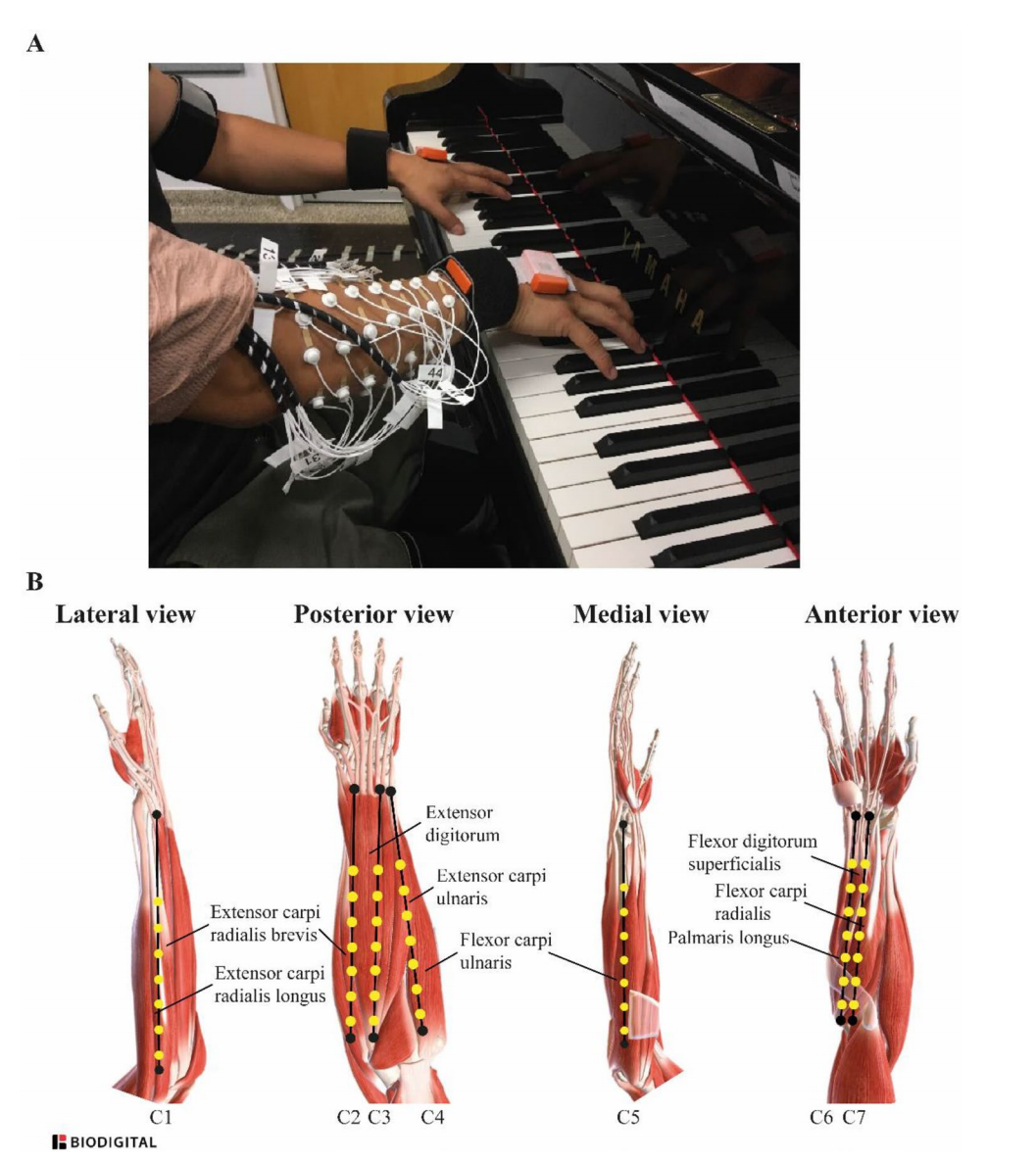 該研究招募了49名鋼琴演奏家, 并要求其完成兩項(xiàng)鋼琴演奏任務(wù)(“數(shù)字任務(wù)”與“和弦任務(wù)”)。在過(guò)程中采集上肢肌電、關(guān)節(jié)角度數(shù)據(jù)、疲勞誘發(fā)時(shí)間等數(shù)據(jù)。
